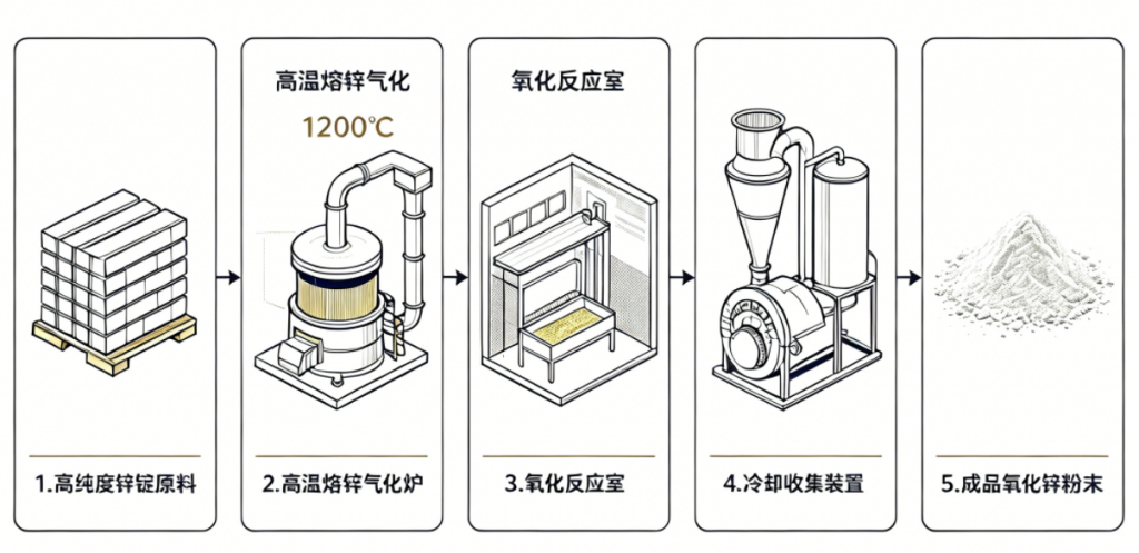 间接法氧化锌又称法国法氧化锌,于1844年由法国科学家勒克莱尔推广普及,其生产工艺区别于直接法,以高纯度金属锌锭或锌渣为原料,经高温熔融、蒸发、氧化、冷却、收集等一系列精密工序制成,核心工艺特征凸显规范性与可控性,具体流程如下: